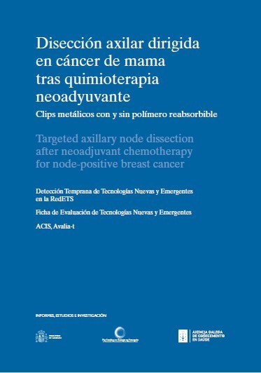El cáncer de mama es una enfermedad de gran impacto en el sistema sanitario. El programa de detección de tecnologías nuevas y emergentes del Ministerio de Sanidad busca priorizar tecnologías que mejoren el manejo de esta dolencia. El uso de marcadores metálicos en la disección axilar dirigida (DAD) se seleccionó como una tecnología nueva que permite extraer selectivamente tejido axilar afectado. Como resultado de la extracción selectiva se reducen los efectos secundarios y se mejora la calidad de vida de las pacientes. La evidencia publicada sobre los marcadores metálicos describe una tasa de falsos negativos inferior al 10 %, límite marcado por los expertos para el empleo de la DAD. Sería necesaria su evaluación comparativa con el sistema actualmente utilizado para conocer su seguridad y efectividad relativas.