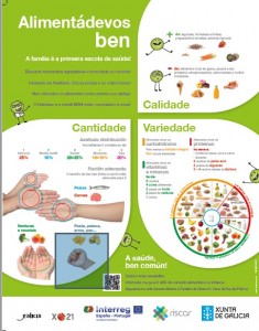 Cartel con información para unha dieta saudable; vaise distribuír nos centros de saúde e hospitais con servizo de pediatría, centros escolares públicos e privados, escolas infantís e supermercados.