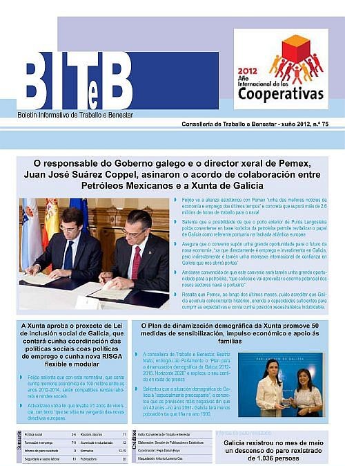 Publicación periódica mensual na que se recollen novas sobre as actuacións máis salientables da Xunta de Galicia nos eidos laboral e do benestar. Acompaña á publicación unha recompilación normativa de lexislación relacionada con estes ámbitos de carácter autonómico (DOG e diarios das restantes comunidades autónomas), estatal (BOE) e comunitario (DOUE). Tamén se dá unha relación das publicacións editadas en rede cos seus enlaces para a súa descarga.