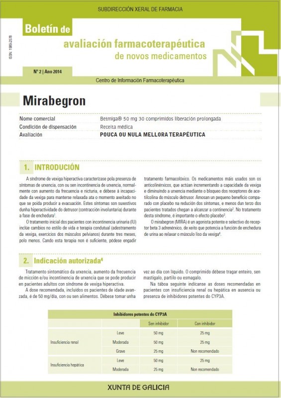 Boletín que presenta a avaliación da eficacia e seguridade do MIRABEGRÓN, novo fármaco indicado no tratamento dos síntomas asociados á síndrome de vexiga hiperactiva.