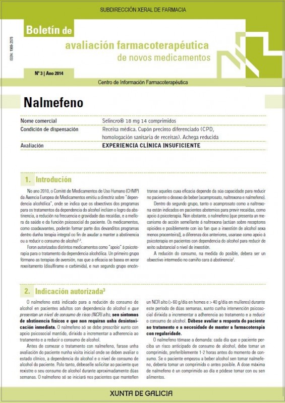 Boletín en liña no que se presenta o novo medicamento NALMEFENO, indicado para a redución do consumo de alcol en pacientes adultos con dependencia e que presentan un nivel de consumo de risco (NCR) alto, sen síntomas de abstinencia físicos e que non requiren unha desintoxicación inmediata. Usarase como apoio á psicoterapia en pacientes con dependencia de alcol para reducir de maneira substancial o nivel de inxesta,