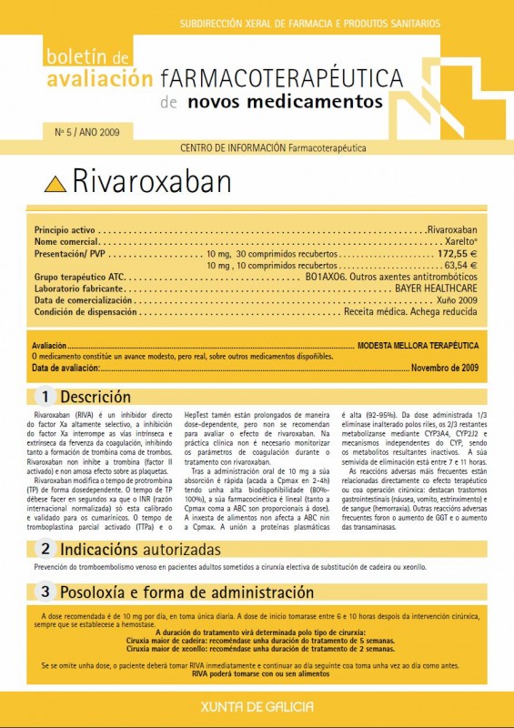 Boletín no que se presenta o RIVAROXABAN, medicamento indicado para la prevención de eventos tromboembólicos, centrándose a análise na súa eficacia e seguridade.