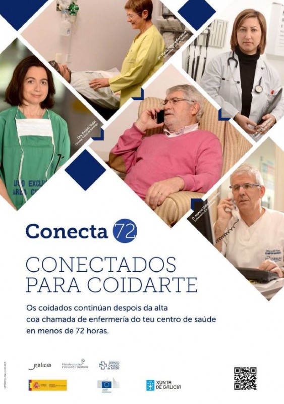 Cartel relativo ao programa CONECTA 72, que pretende mellorar a comunicación entre a enfermería de atención primaria e o paciente tras a alta hospitalaria deste, ao tempo que se procura a integración entre profesionais de enfermería de distintos niveis asistenciais o que permitirá mellorar a continuidade dos coidados.