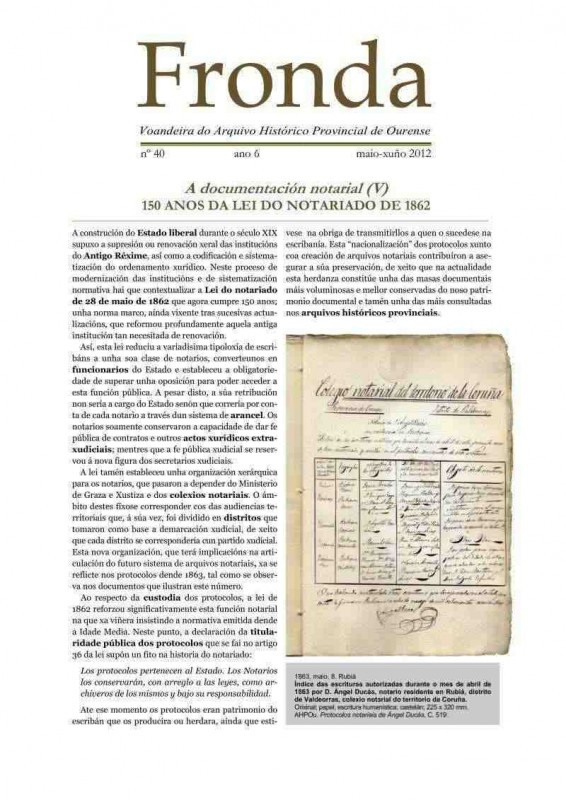 Fronda é unha publicación periódica bimestral en forma de folla voandeira coa que o Arquivo Histórico Provincial de Ourense (AHPOu) achega a un público amplo o contido dos seus fondos documentais e o contexto histórico no que estes foron producidos. Neste número (40), a partir dun protocolo notarial do ano 1863, conmemórase o 150 aniversario da Lei do notariado, un texto legal aínda vixente, de gran transcendencia para esa institución e para a conservación do patrimonio documental.