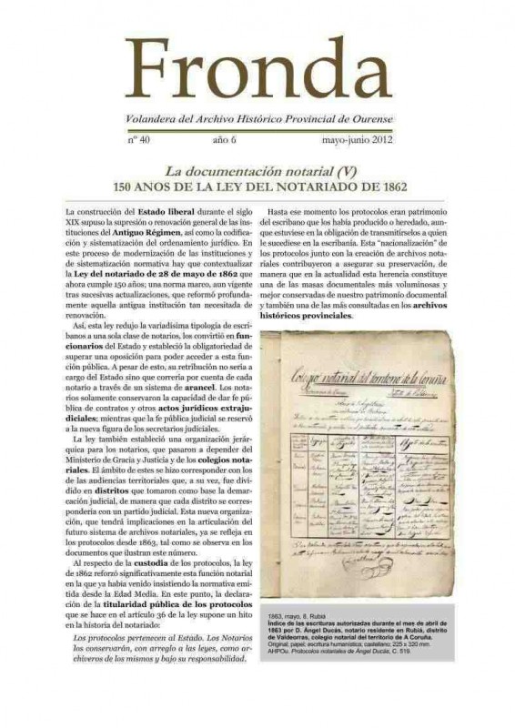 Fronda é unha publicación periódica bimestral en forma de folla voandeira coa que o Arquivo Histórico Provincial de Ourense (AHPOu) achega a un público amplo o contido dos seus fondos documentais e o contexto histórico no que estes foron producidos. Neste número (40), a partir dun protocolo notarial do ano 1863, conmemórase o 150 aniversario da Lei do notariado, un texto legal aínda vixente, de gran transcendencia para esa institución e para a conservación do patrimonio documental.