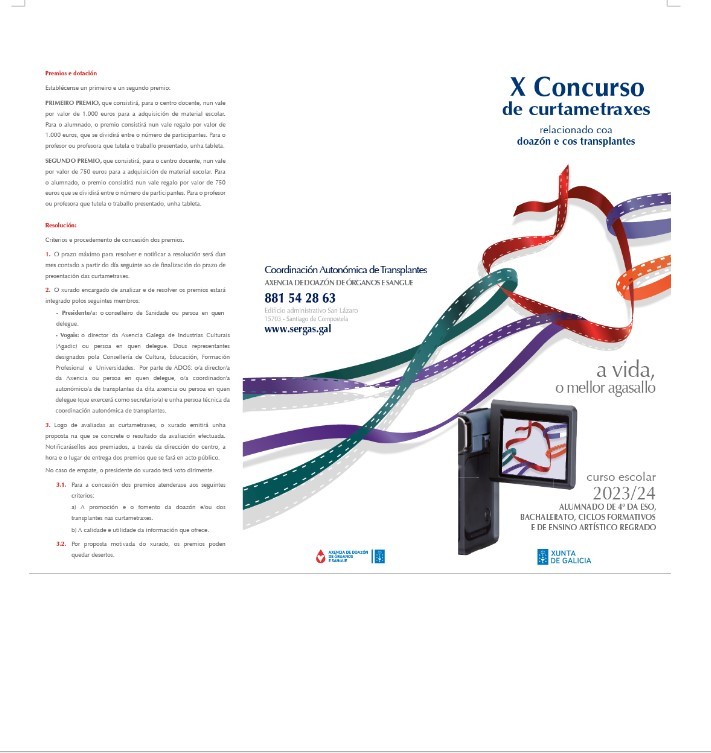 Tríptico (electrónico): coas bases do X Concurso de Curtametraxes dirixido a rapaces e rapazas do curso escolar 2023/24, que ten como tema a doazón e os transplantes. A finalidade é achegar esta realidade á poboación escolar da nosa comunidade autónoma, de modo que os máis novos sexan capaces de valorar os beneficios que o fomento da doazón ten para a cidadanía.
